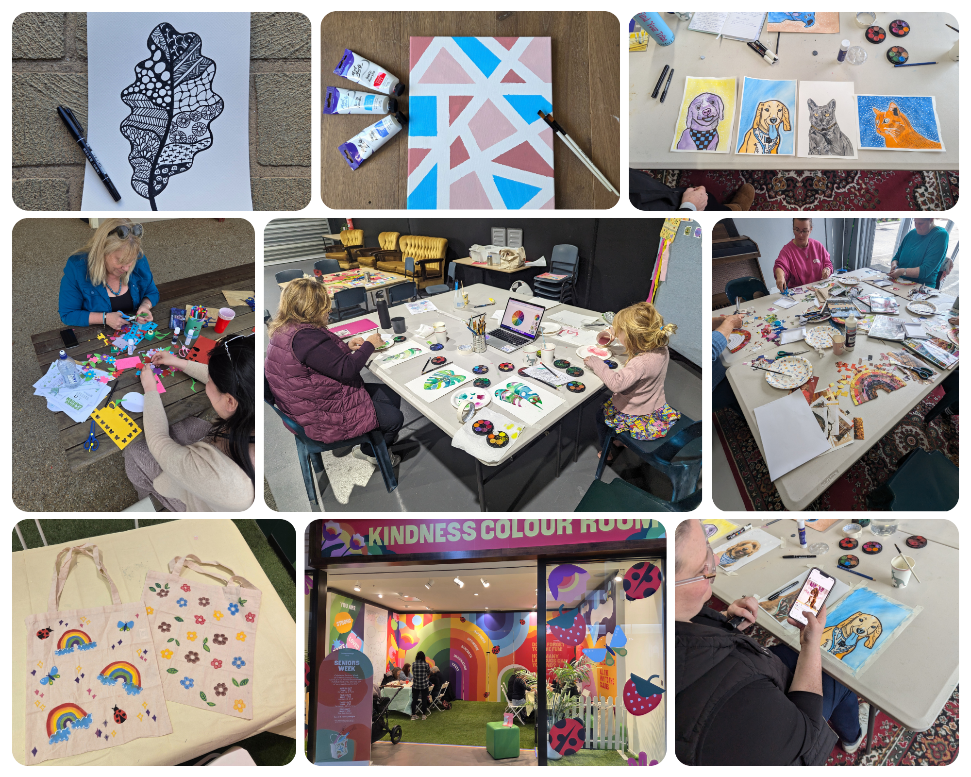 Participants are gently introduced to a range of mediums — including watercolour, acrylic, paper craft, pastels, and drawing — through clear, achievable activities that remove pressure and expectation.